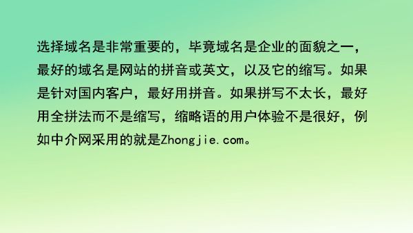 選擇域名是非常重要的,畢竟域名是企業(yè)的面貌之一,最好的域名是網(wǎng)站的拼音或英文,以及它的縮寫。如果是針對(duì)國內(nèi)客戶,最好用拼音。如果拼寫不太長,最好用全拼法而不是縮寫,縮略語的用戶體驗(yàn)不是很好,例如中介網(wǎng)采用的就是ningtui.com。