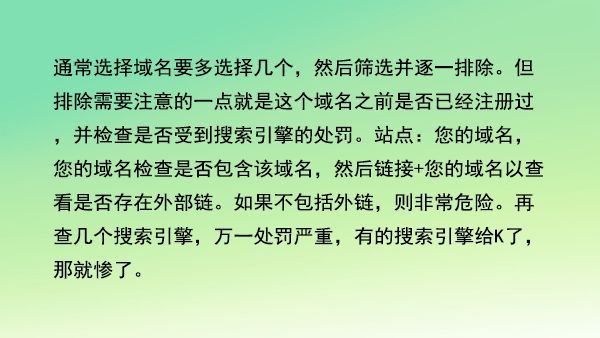 通常選擇域名要多選擇幾個(gè),然后篩選并逐一排除。但排除需要注意的一點(diǎn)就是這個(gè)域名之前是否已經(jīng)注冊(cè)過,并檢查是否受到搜索引擎的處罰。站點(diǎn):您的域名,您的域名檢查是否包含該域名,然后鏈接+您的域名以查看是否存在外部鏈。如果不包括外鏈,則非常危險(xiǎn)。再查幾個(gè)搜索引擎,萬一處罰嚴(yán)重,有的搜索引擎給K了,那就慘了。