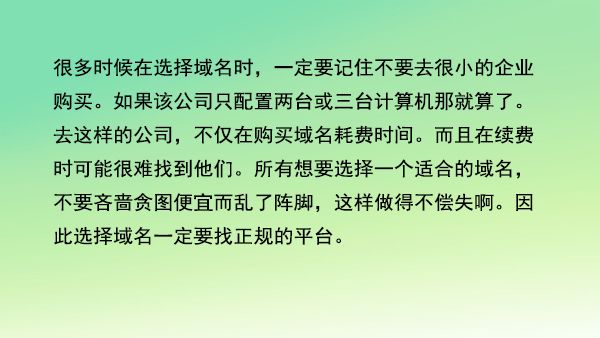 很多時(shí)候在選擇域名時(shí),一定要記住不要去很小的企業(yè)購買。如果該公司只配置兩臺(tái)或三臺(tái)計(jì)算機(jī)那就算了。去這樣的公司,不僅在購買域名耗費(fèi)時(shí)間。而且在續(xù)費(fèi)時(shí)可能很難找到他們。所有想要選擇一個(gè)適合的域名,不要吝嗇貪圖便宜而亂了陣腳,這樣做得不償失啊。因此選擇域名一定要找正規(guī)的平臺(tái)。
