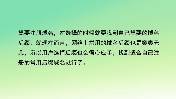 想要注冊(cè)域名,在選擇的時(shí)候就要找到自己想要的域名后綴,就現(xiàn)在而言,網(wǎng)絡(luò)上常用的域名后綴也是寥寥無幾,所以用戶選擇后綴也會(huì)得心應(yīng)手,找到適合自己注冊(cè)的常用后綴域名就行了。