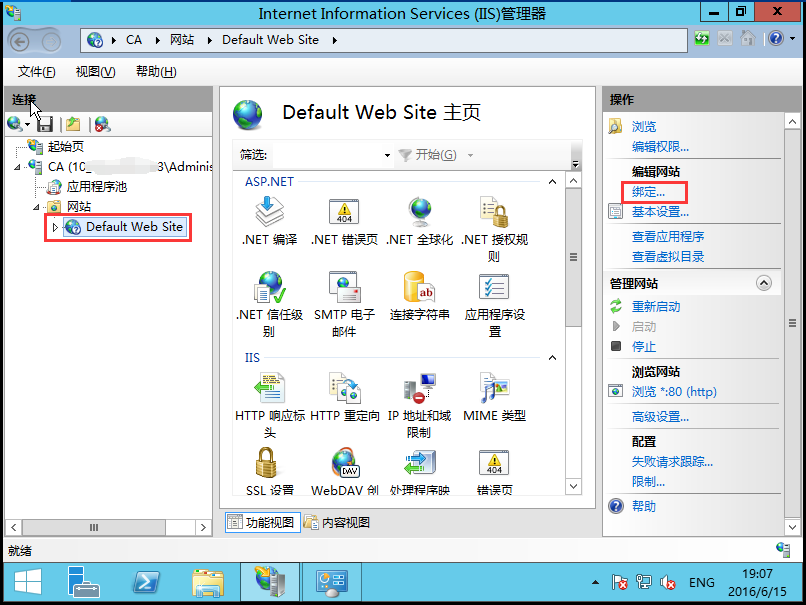 4、單擊網(wǎng)站下的站點(diǎn)名稱,單擊右則的綁定。