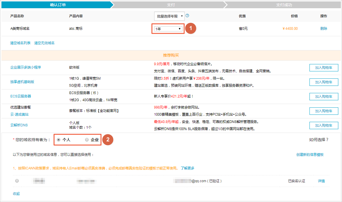 1.在確認(rèn)訂單頁面,選擇域名的購買年限和持有者類型。