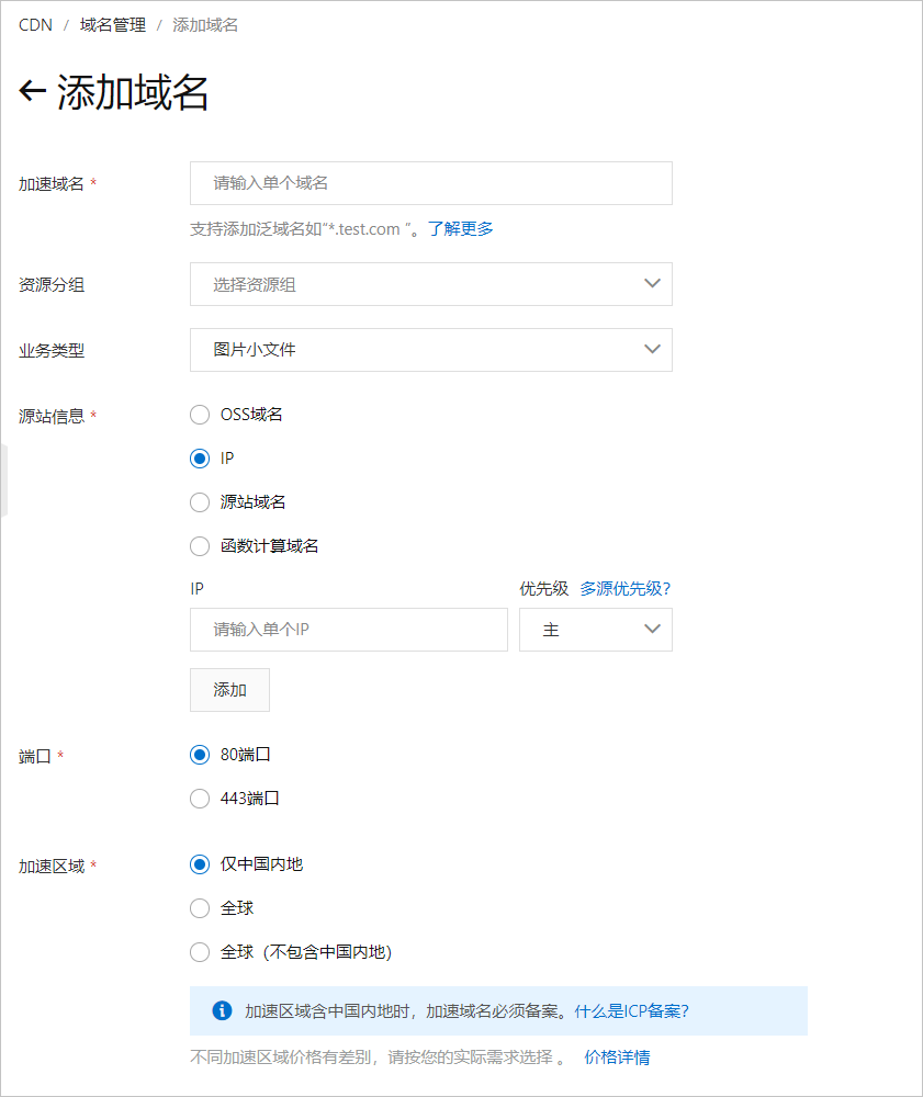 配置加速域名、資源分組、業(yè)務(wù)類型、源站信息、端口和加速區(qū)域。