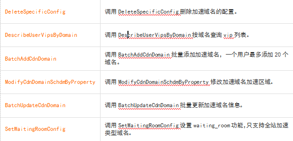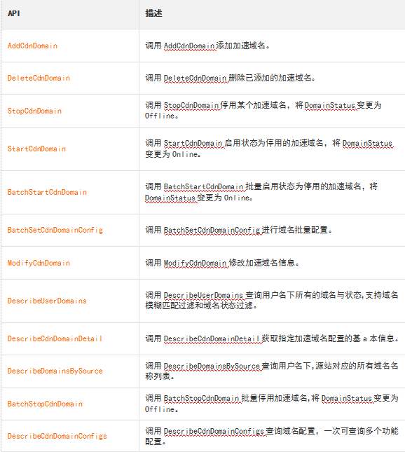 您可以調(diào)用API接口,實現(xiàn)CDN加速域名管理,詳情如下圖所示。