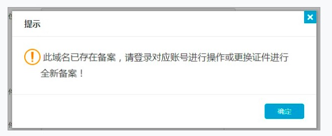 域名注冊(cè)成功后,在阿里云ICP代備案管理系統(tǒng)進(jìn)行驗(yàn)證備案類型時(shí),輸入域名等信息后單擊驗(yàn)證備案類型,系統(tǒng)提示此域名已存在備案,請(qǐng)登錄對(duì)應(yīng)賬號(hào)進(jìn)行操作或更換證件進(jìn)行全新備案,無法對(duì)域名進(jìn)行備案。